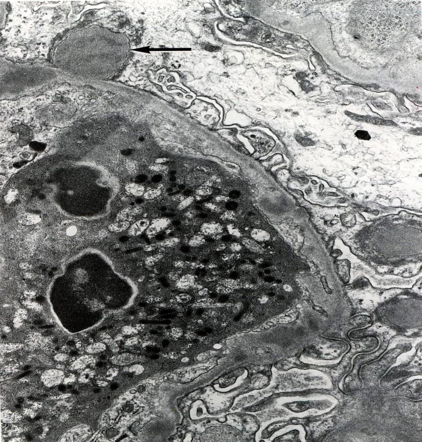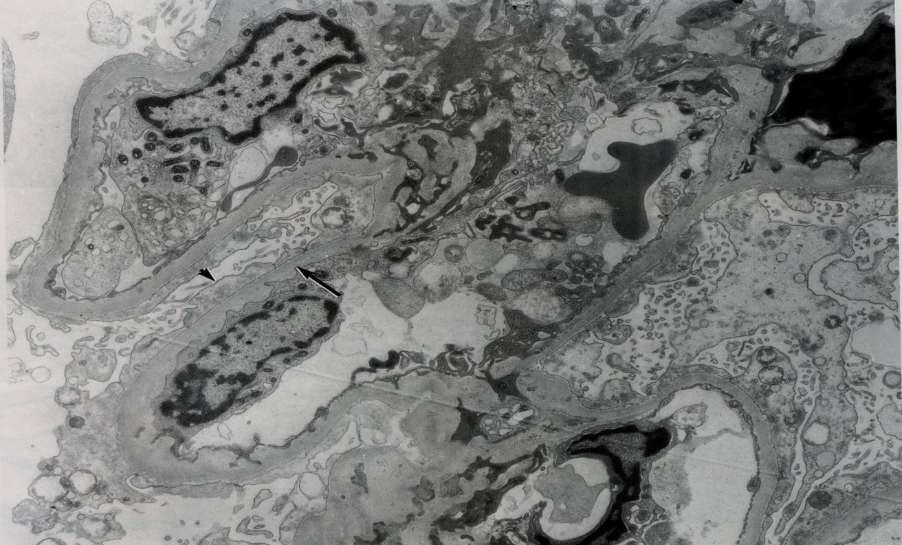 Inflammatory cells surround the compressed capillary loops in the form of a crescent moon