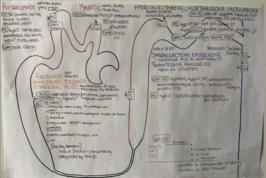 triamterene, amiloride= inhibit Na channels [resorb] (and the paired K/H channel [excrete K]) in CD
