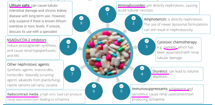 Name 8 drugs that can cause nephrotoxicity
