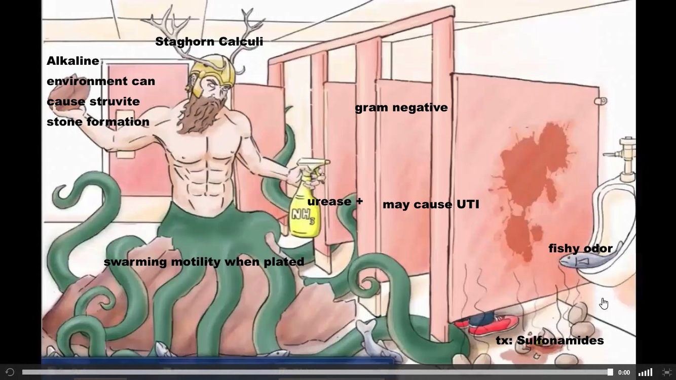 (urease → ⬆ pH → kidney struvite stones → stag horn calculi on imaging)
