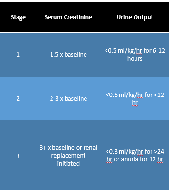 -Failure/Stage 3- 3+x increase in serum creatinine from pts baseline OR decline of urine output to <0.3mL/kg/hr for 24 hr or anuria for 12 hours