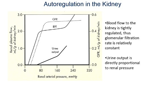 From ~80mmHg up the GFR remains constant. This is because the blood flow to the kidney is tight regulated