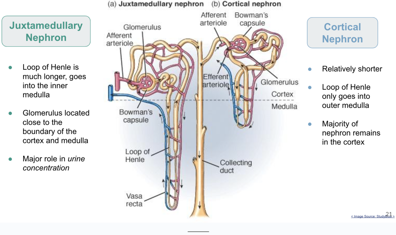 Compare and contrast a juxtamedullary and cortical nephron