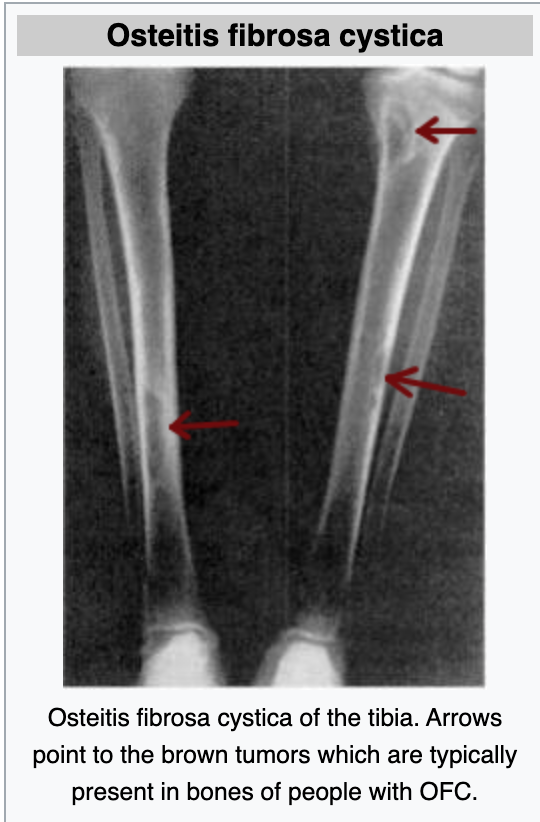* weakening of bones and calcified structures - this is replaced with fibrous tissue (peritrabecular fibrosis)