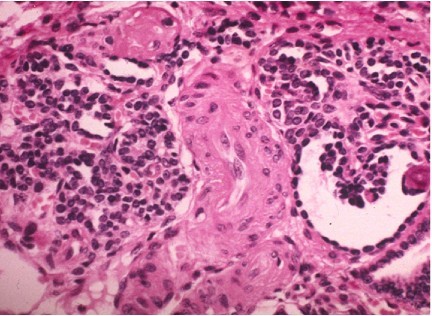 Histology: thyroidization, eosinophilic infiltration