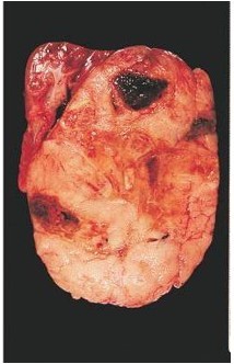 Gross: Large round demarcated tumor with tan-grey, fleshy, hemorrhagic surface