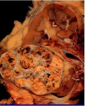 Grossly: Clear cell RCC: well circumscribed, golden yellow, cystic solid, hemorrhagic, necrosis.