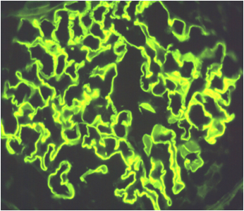 Laboratory studies: Cr 1.3, TC 556, Albumin 1.8, Ur Protein: Cr ratio 13, C3 135, C4 38