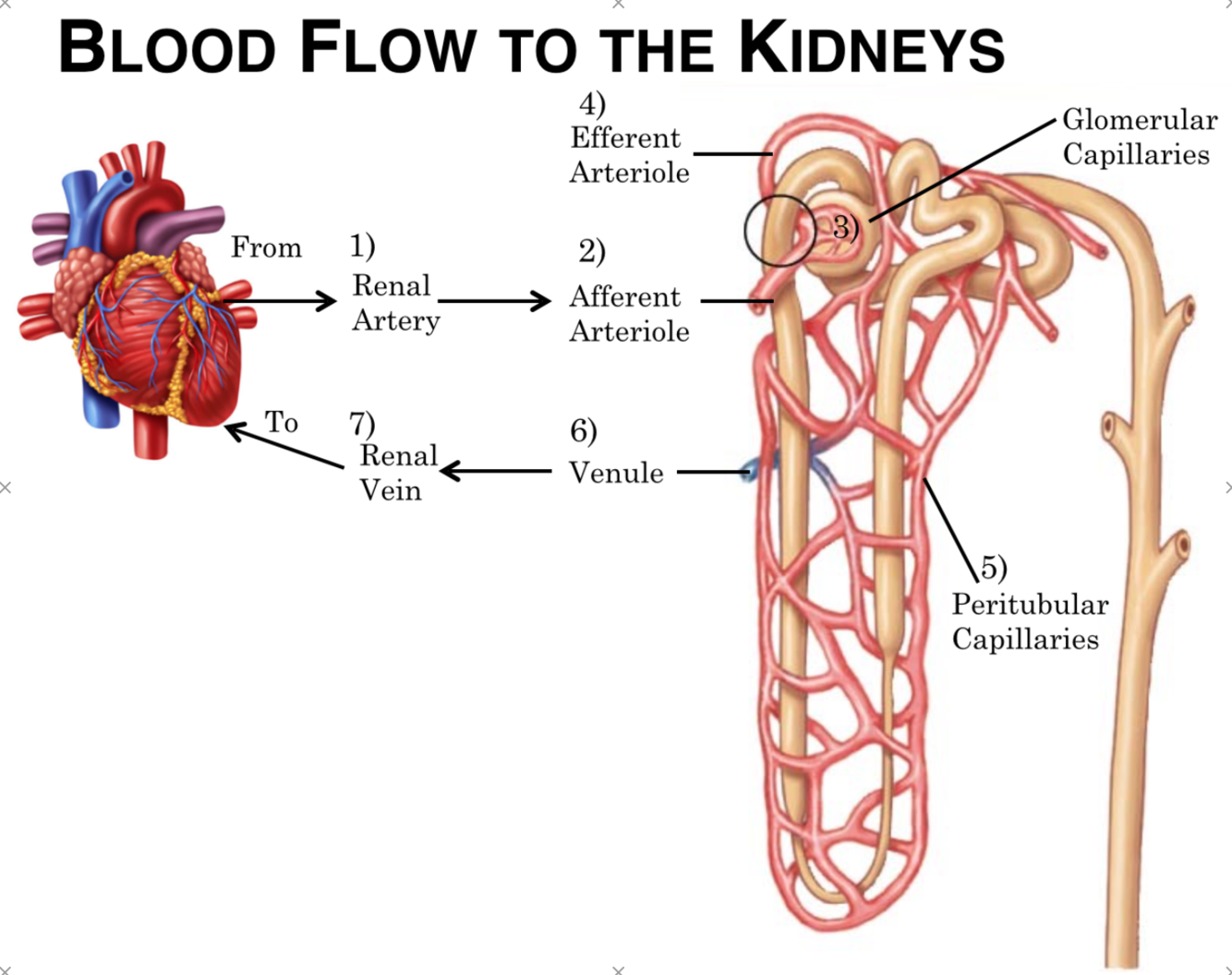 Heart → Renal artery → Afferent arteriole → Glomerular capillaries → Peritubular capillaries/Vasa Recta → Efferent arteriole → Venule → Renal Vein → Heart