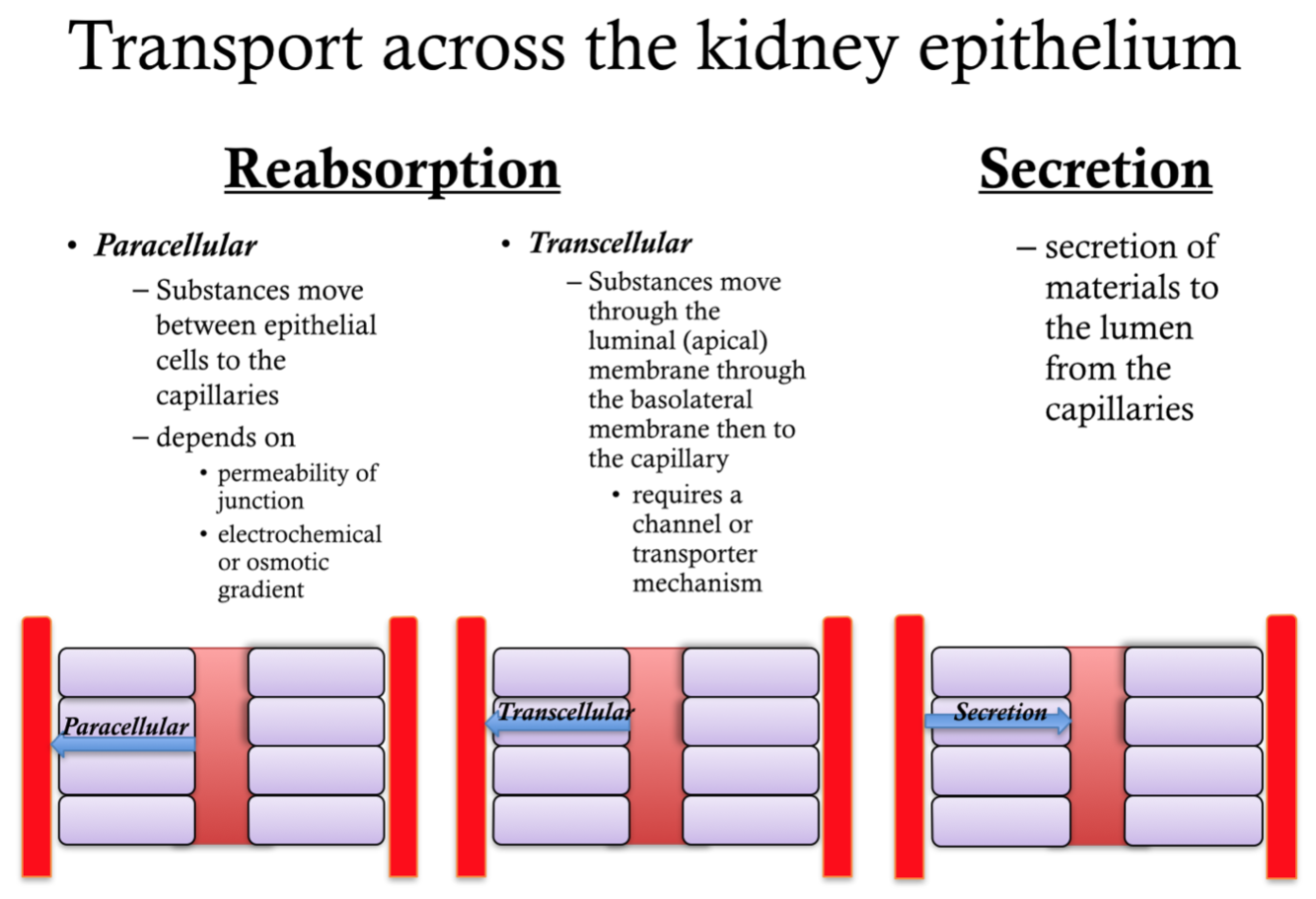 Note: Transcellular does NOT require channels/transporters, but paracellular reabsorption does.