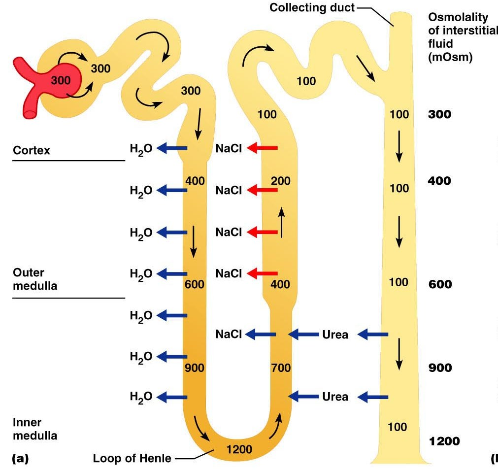 o Interstitial osmolarity elevates (more ions) - draws water out of descending - solute concentration of the fluid in ascending limb is higher - causing more pumping – increases interstitial osmolarity more, more water drawn out of descending..etc..
