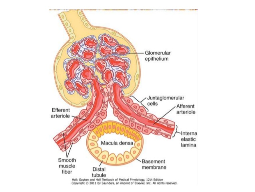 If sodium flow is too high/low then the macula densa prompts granular cells to secrete renin. This causes constriction of the afferent and efferent arterioles, to modify the ‘flow’ of sodium and ultimately the excretion of sodium within the urine.