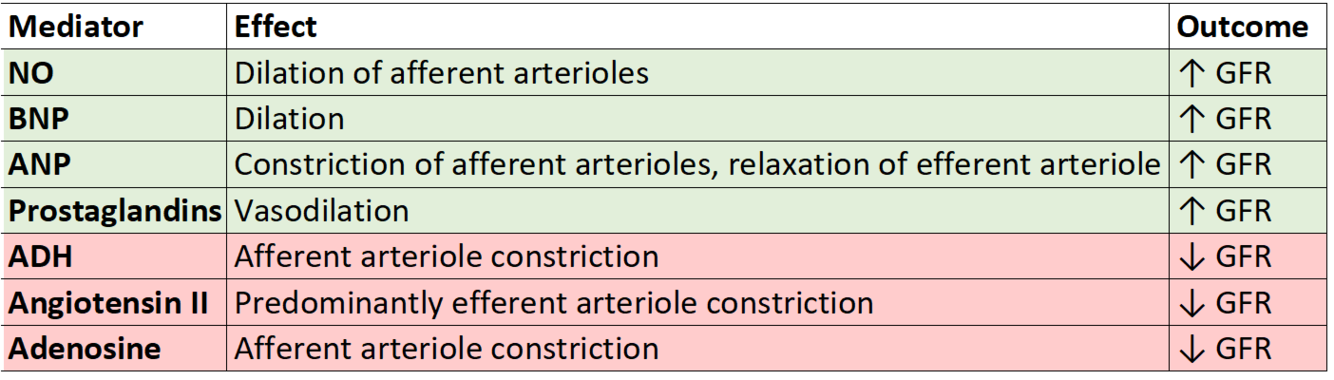 NO, prostaglandins, BNP, ANP, ADH, angiotensin II, adenosine