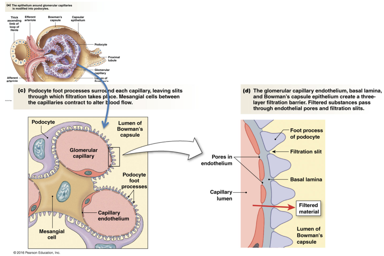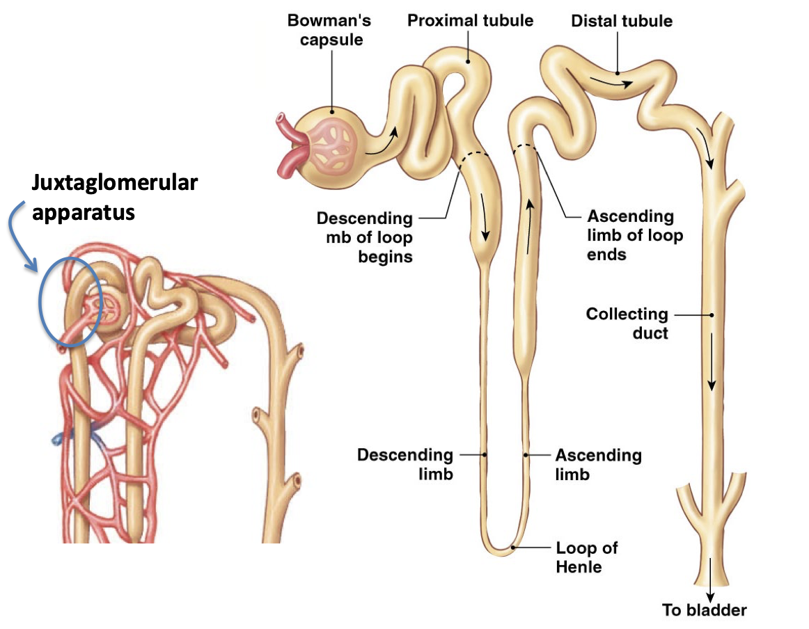 Renal corpuscle (glomerulus + Bowman’s capsule) = filtration of mostly protein-free plasma from the capillaries into the capsule