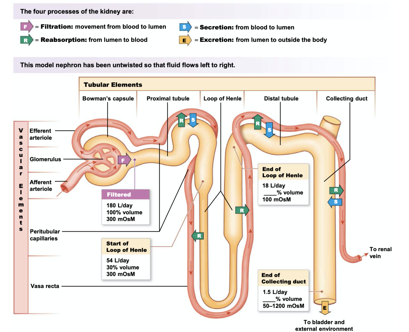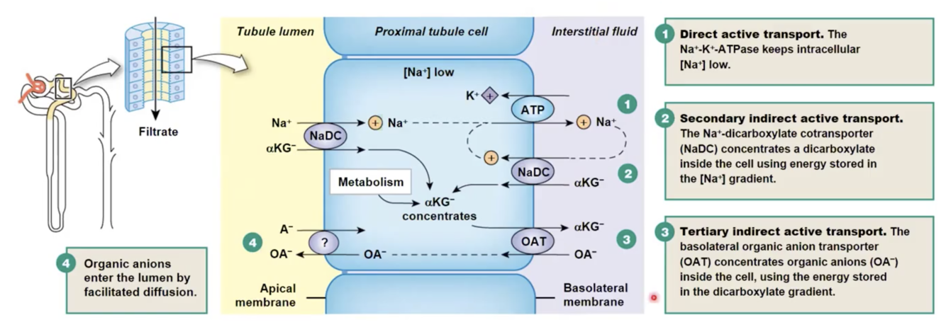 Proximal tubule = isoosmotic reabsorption of organic nutrients, ions, and water. Secretion of metabolises and xenobiotic molecules such as penicillin