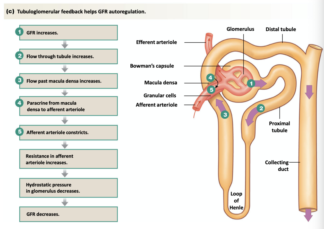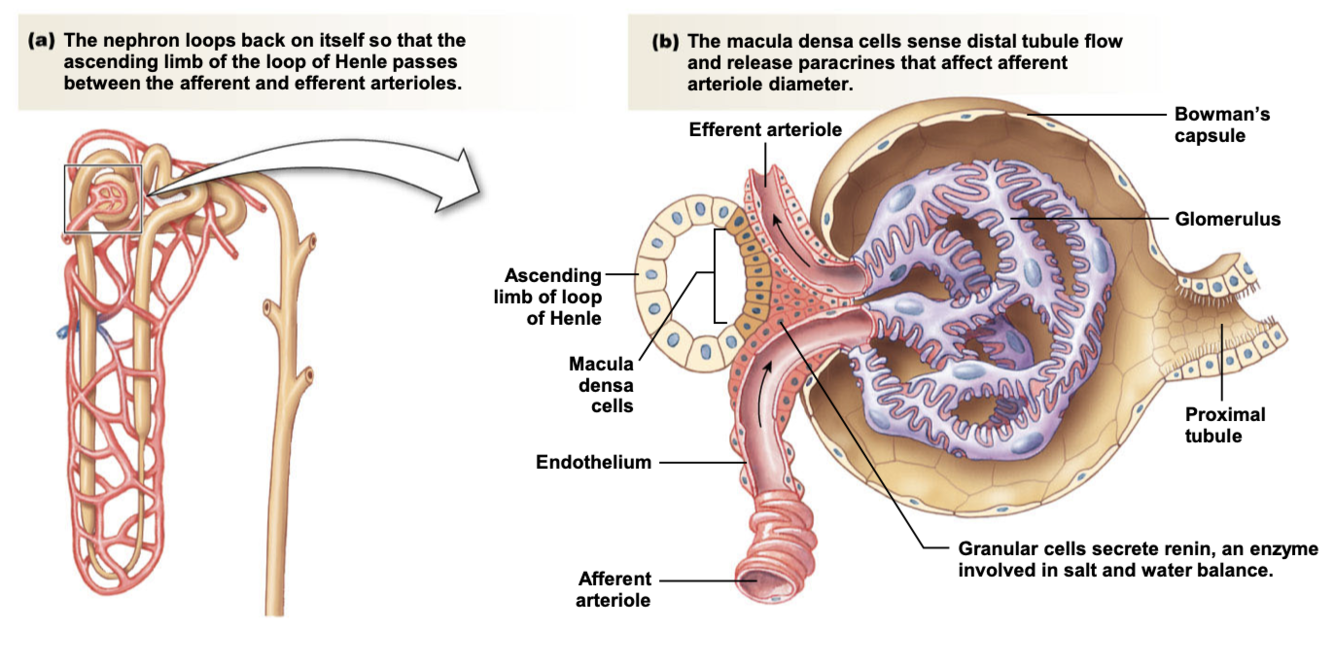 Macula densa cells sense distal tubule flow and release paracrines that impact afferent arteriole diameter. Can release ATP, nitric oxide, adenosine