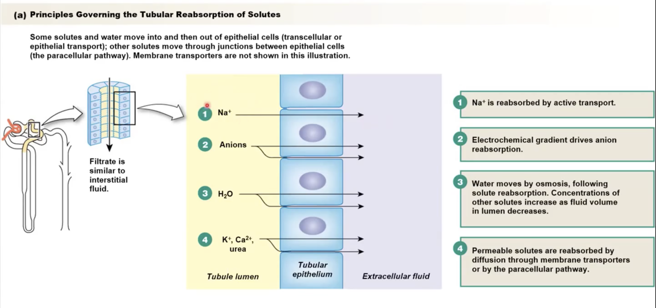 Active pumping of Na+ generates an electrochemical gradient which drives anion reabsorption. This then drags water across via osmosis which increases concentration of other solutes, causing them to diffuse