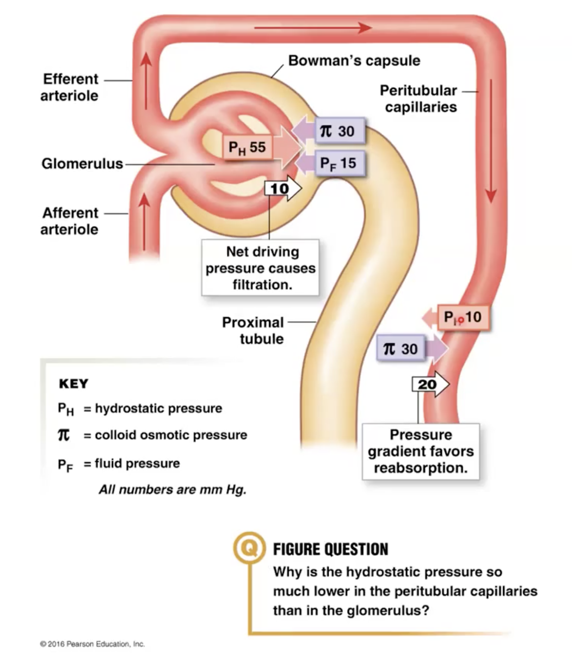 Pressure favours filtration in glomerulus but reabsorption in peritubular capillaries