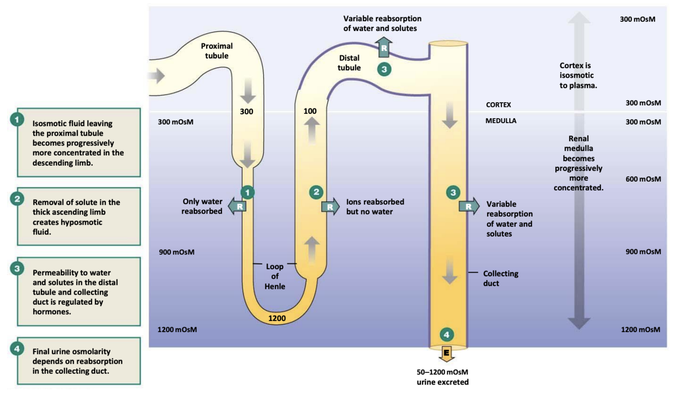 Loop of Henle = reabsorption of ions in excess of water to create dilute fluid in the lumen. COuntercurrent arrangement contributes to concentrated interstitial fluid in the renal medulls