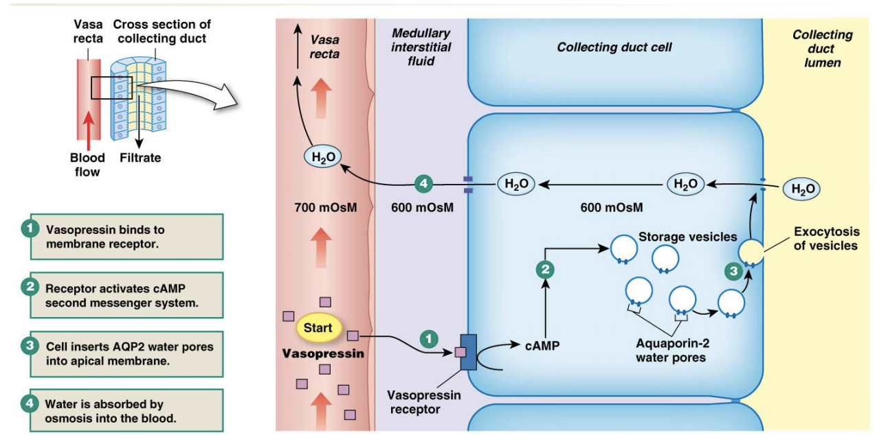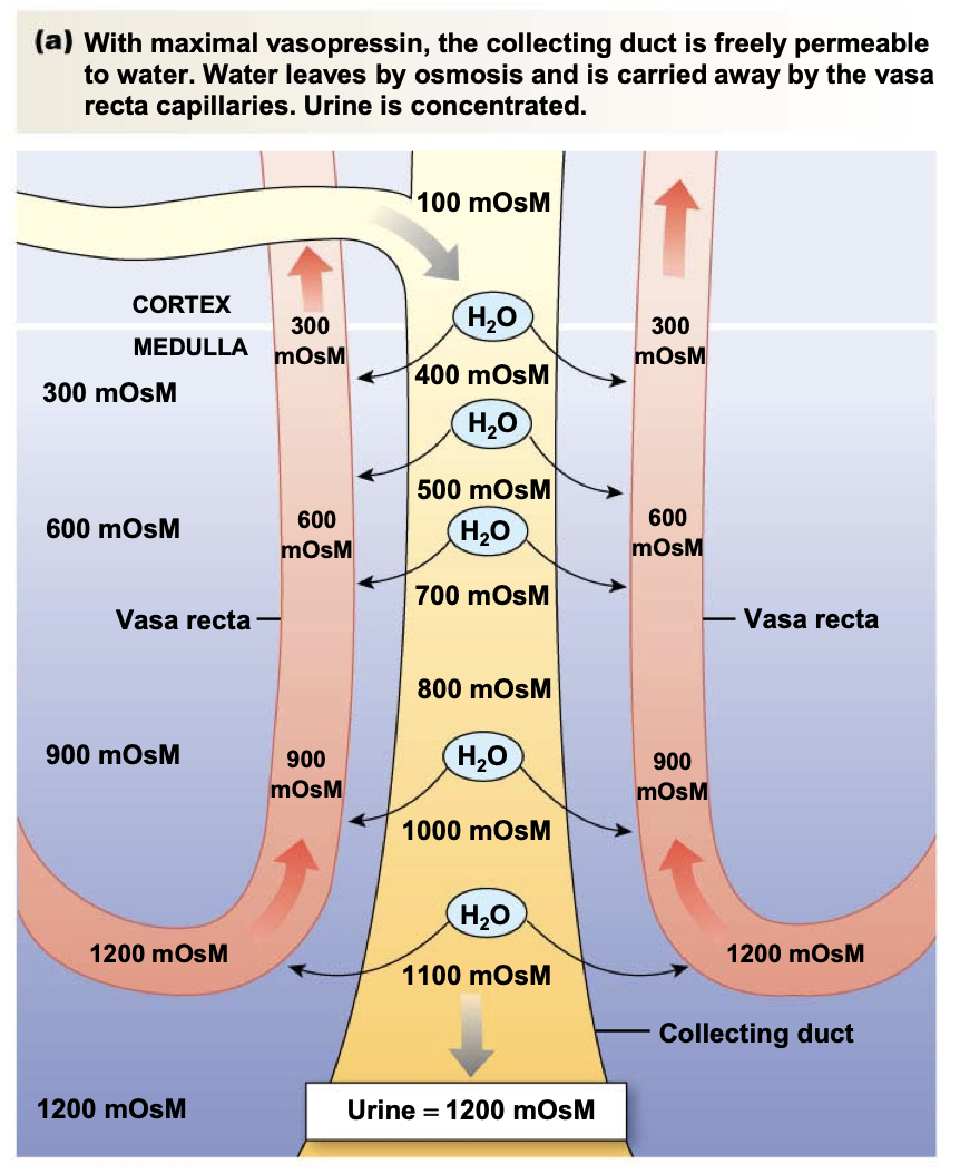It does this by inserting water pores into apical membranes of the collecting duct, making them permeable to water. Water leaves by osmosis and is carried away by the vasa recta capillaries. Urine is concentrated. Linked to the countercurrent exchange mechanism