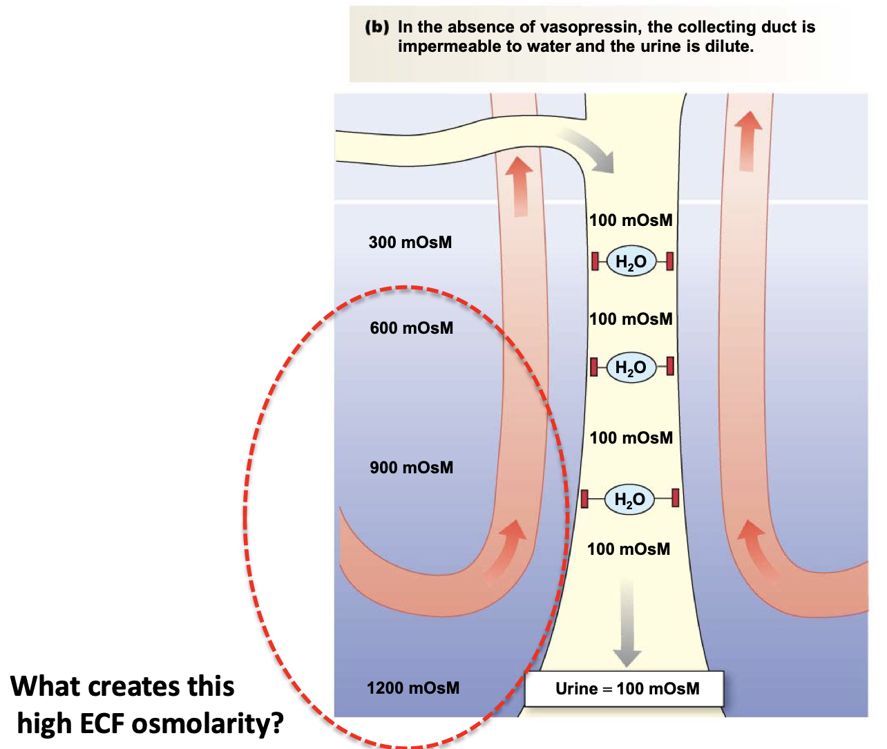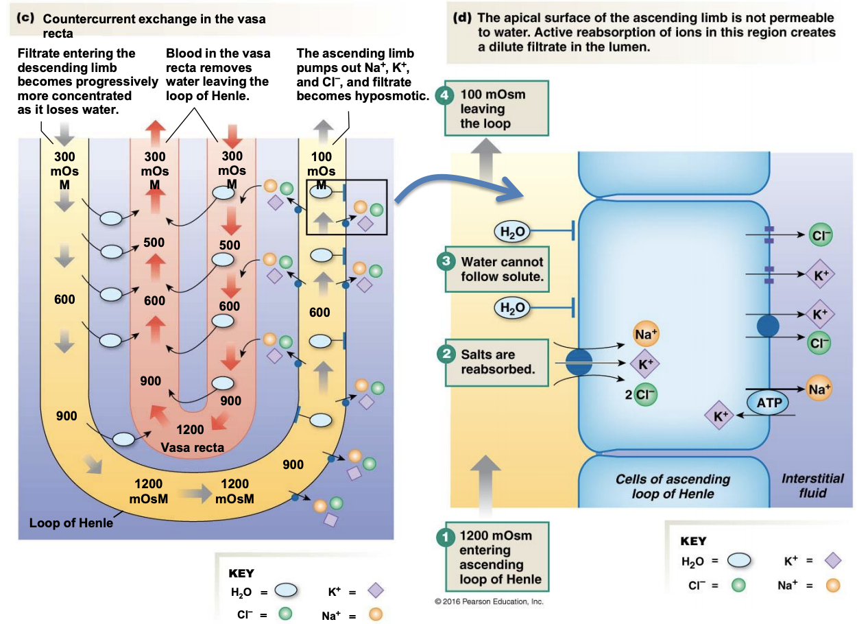 At the same time blood going down at low osmolarity is in close proximity with blood going up at high osmolarity. This causes osmosis again, increasing osmolarity at the bottom of the loop and decreasing it at the top