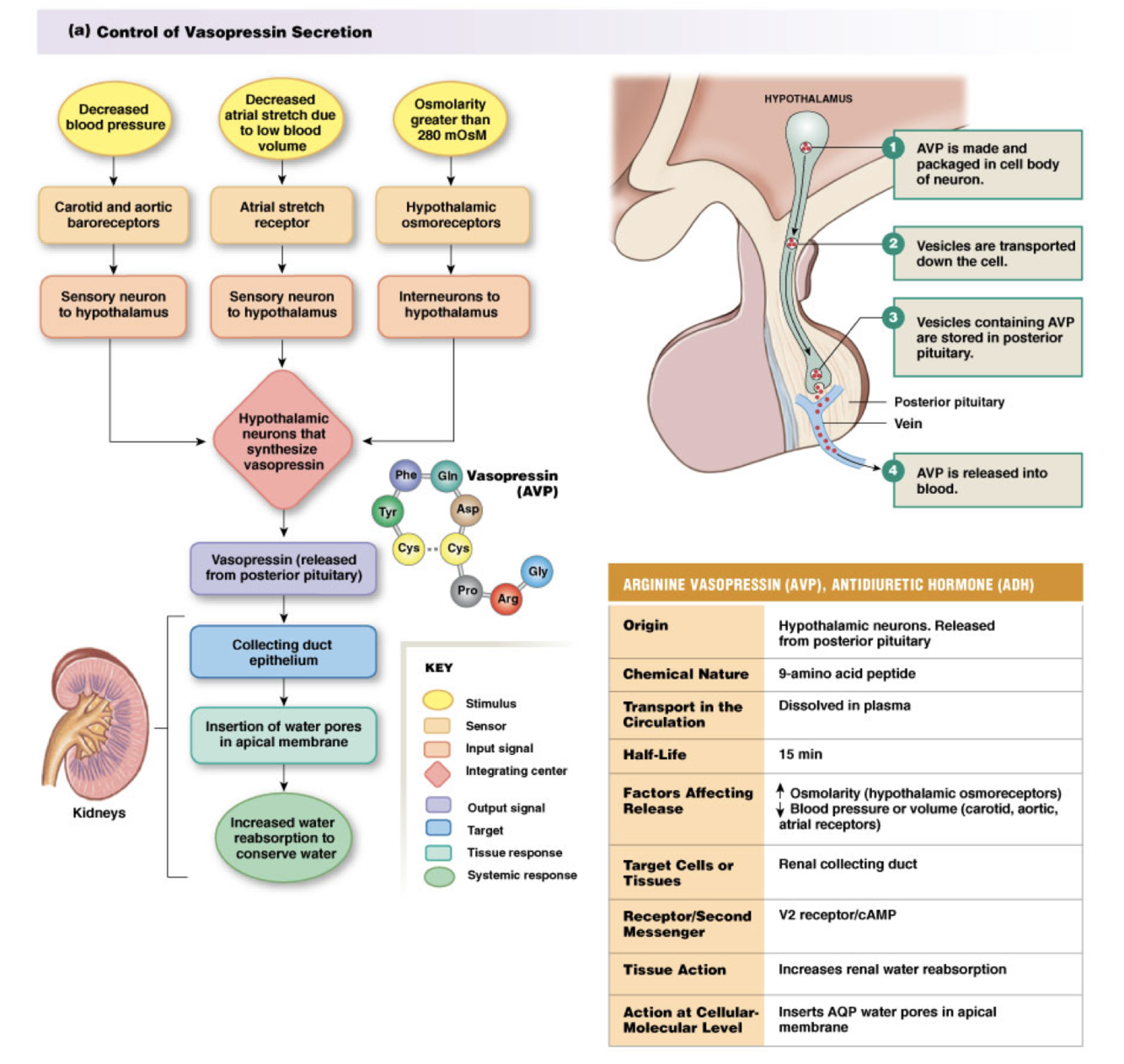Vasopressin is a hormone released from the posterior pituitary. It triggers increased water reabsorption in the nephron to conserve water.