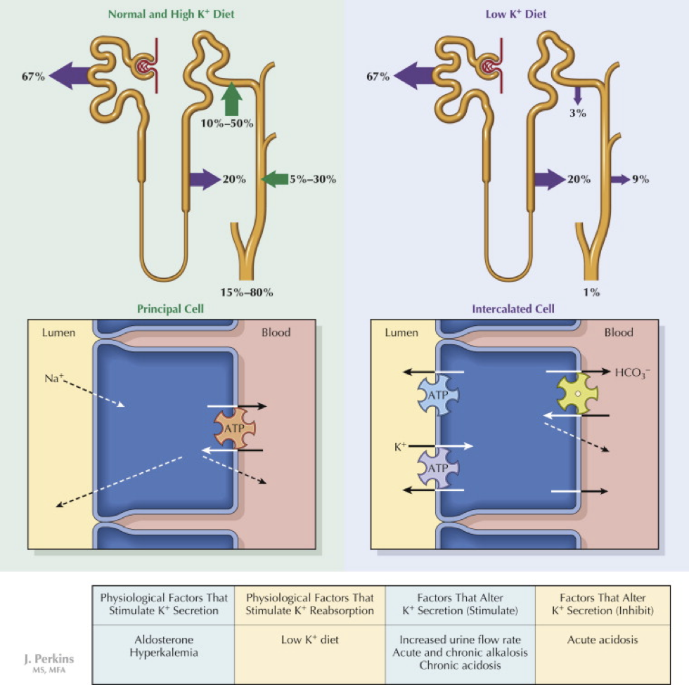 High K causes secretion of aldosterone, which causes Na absorption and K to be secreted into UF at the late distal tubule and the collecting ducts.