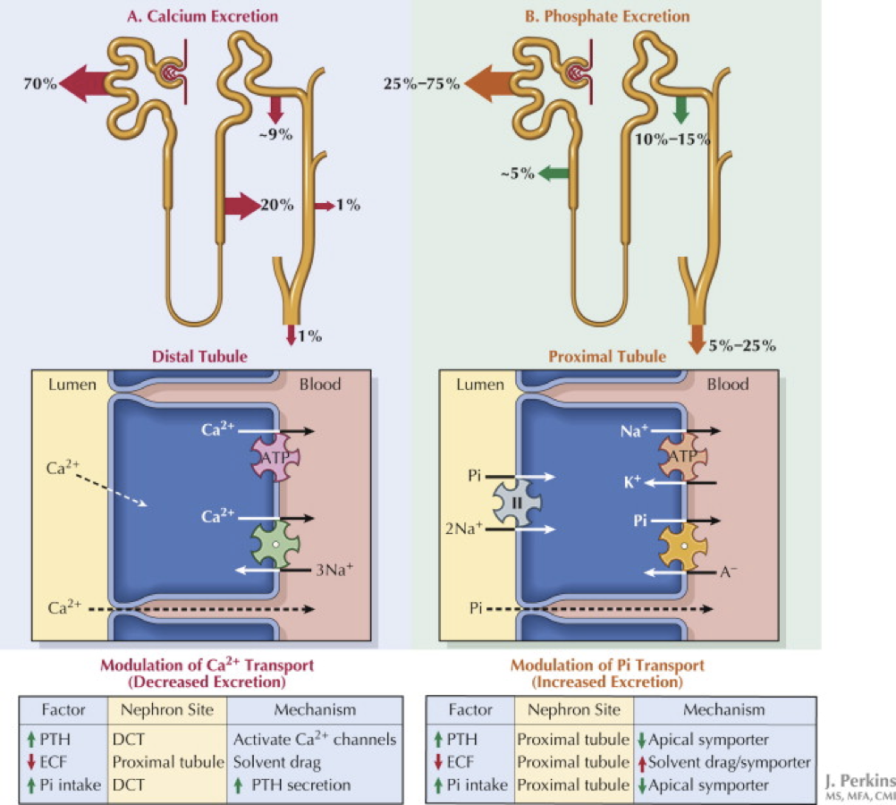 60% of Ca2+ is freely filtered at the glomeruli and 99% of that is reabsorbed. How and where is Ca2+ reabsorbed?