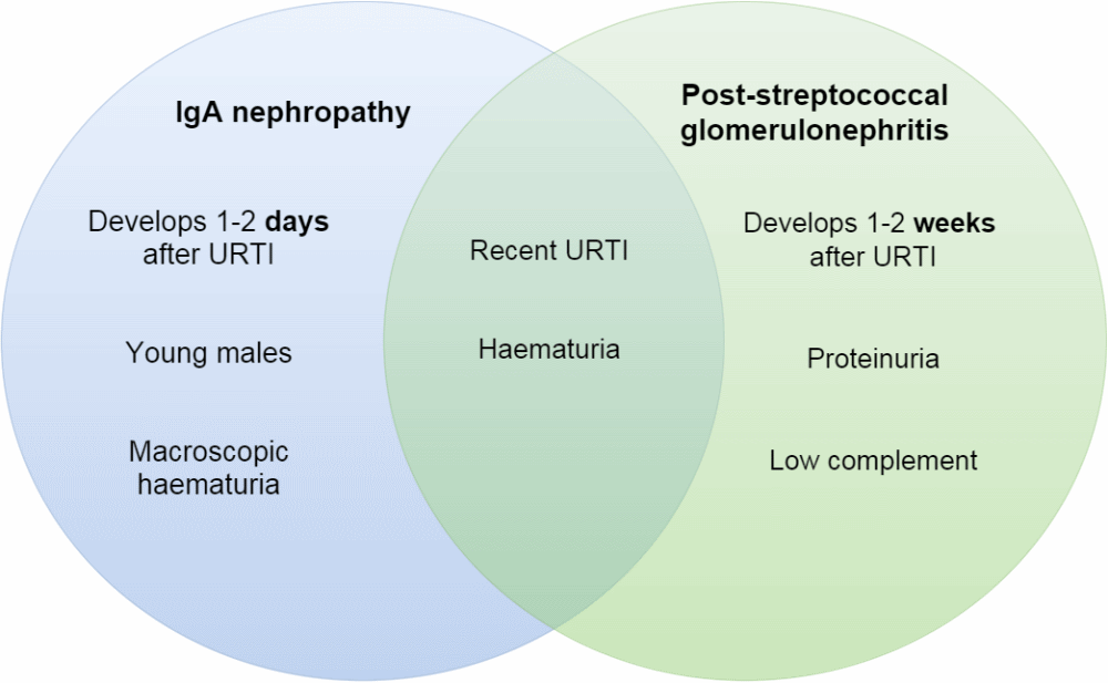 Compare IgA nephropathy & post-streptococcal glomerulonephritis