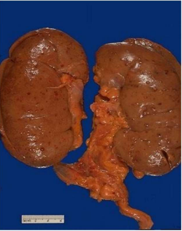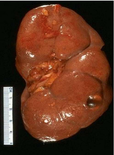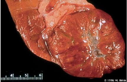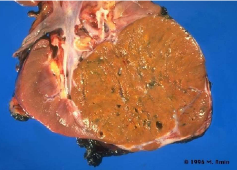 Descrizione: Nodulo ben delimitato del rene di colore bruno con cicatrice centrale (ruota di carro).