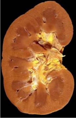 Sezione di rene con formazione nodularecavitata di colore grigiogiallo a contenuto purulento