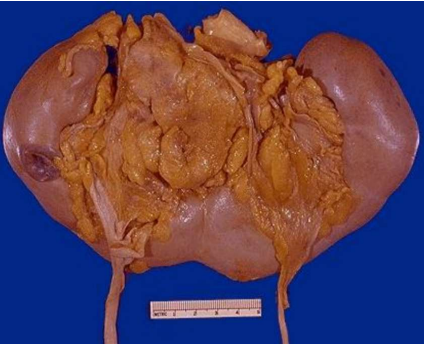Descrizione: Rene quasi interamente sostituito da una neoformazione di colore grigio-bianco. Il