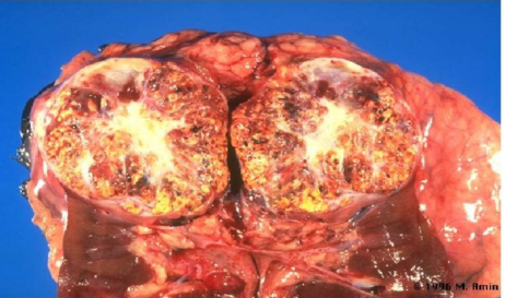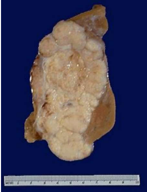 Descrizione: Nodulo del rene a margini irregolari di colore grigio-giallo. Nefrectomia, si osserva