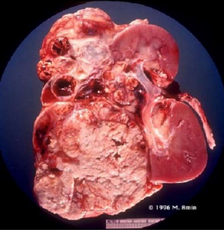 Descrizione: Rene quasi interamente sostituito da una neoformazione plurinodulare di colore grigiobianco.
