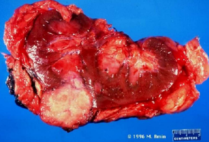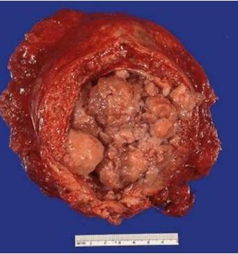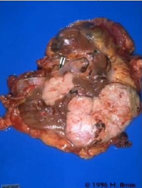 giallo brunastra con aree emorragiche (carcinoma papillare tipo 2).