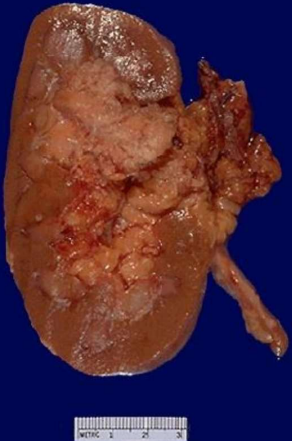 massa che infiltra e sostituisce il parenchima renale, colore eterogeneo prevalentemente biancastro