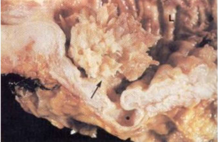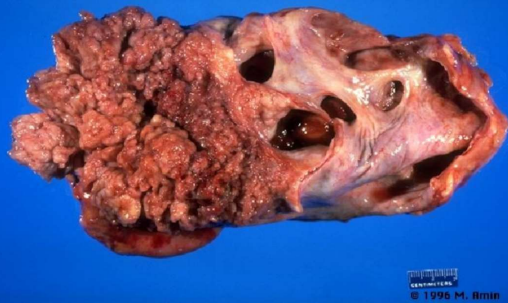 Descrizione: Neoformazione a margini irregolari con vegetazioni papillari che occupa parte della