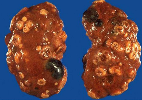 Descrizione: Parenchima renale con noduli multipli diffusi di aspetto solido e cistico a contenuto
