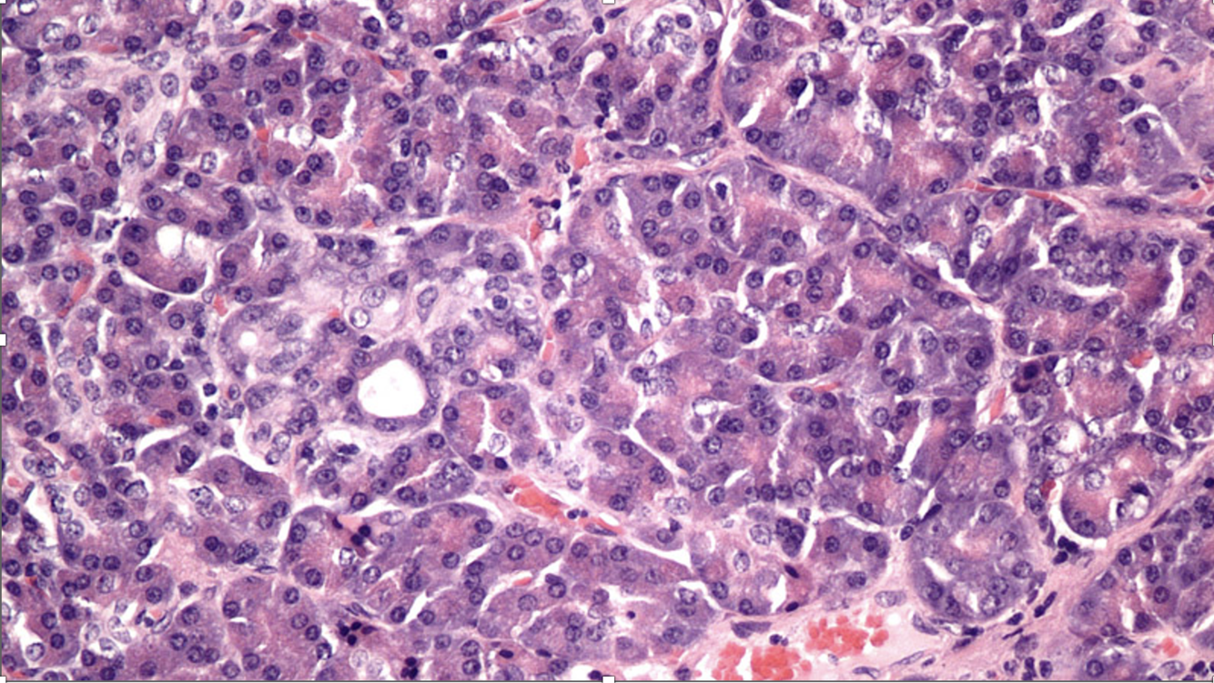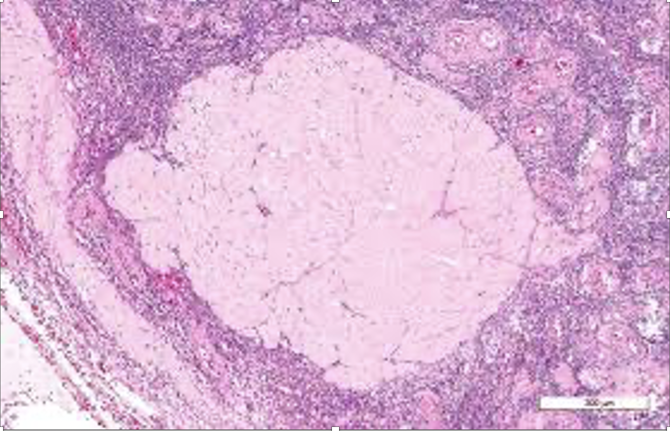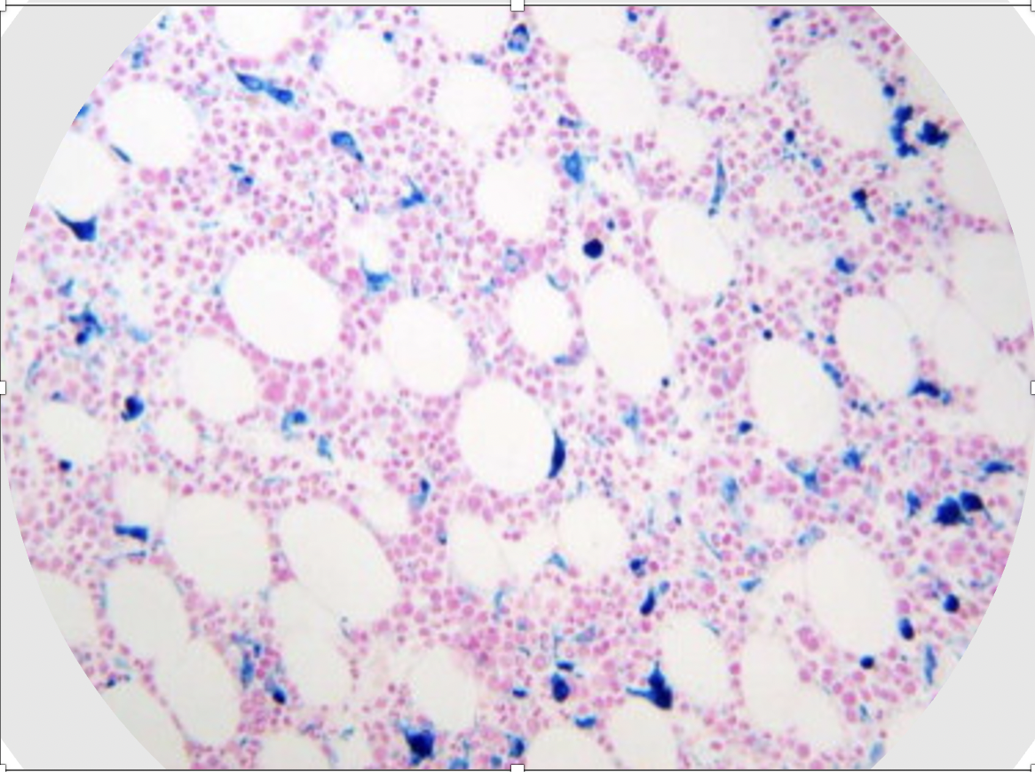 Tinción: Pearls (depositos de hierro en azul)