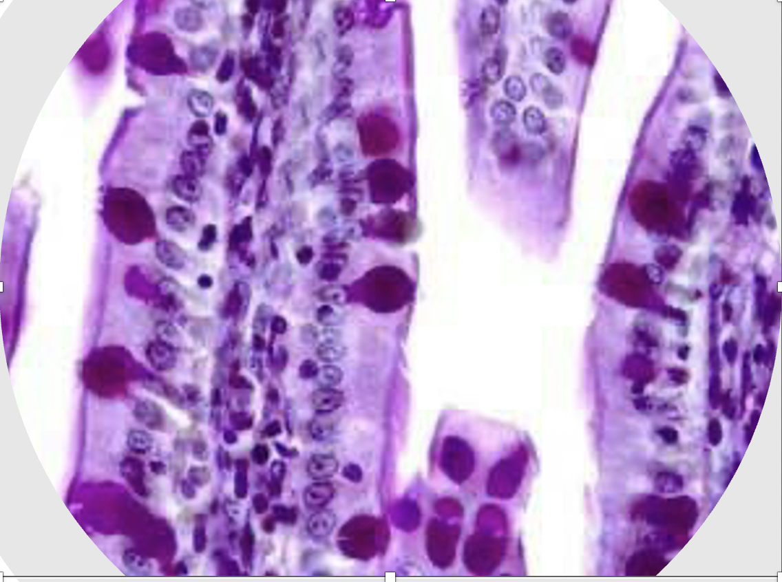 Epitelio: cilindrico simple con células calciformes