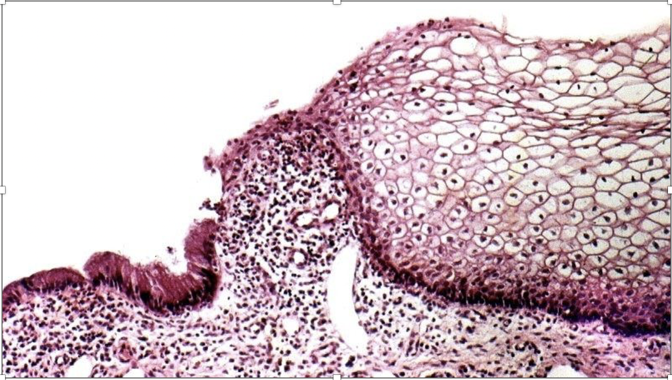 órgano: cervix (plano estratificado) y endocervix (cilindrico simple)
