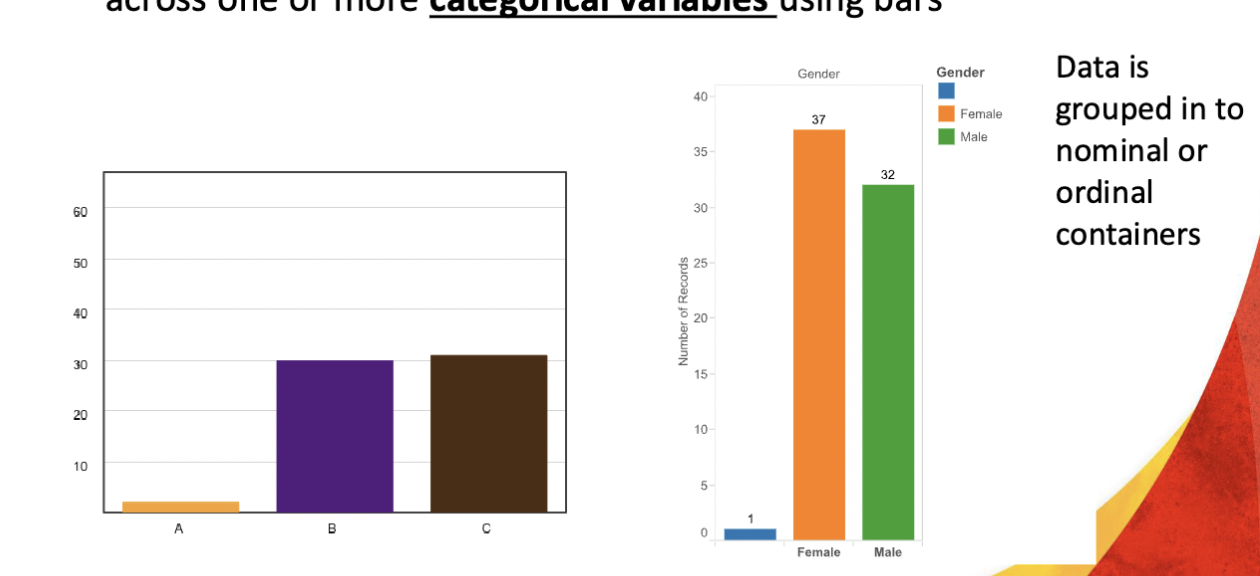 * Visual representation of the quantity of some measure across one or more categorical variables using bars