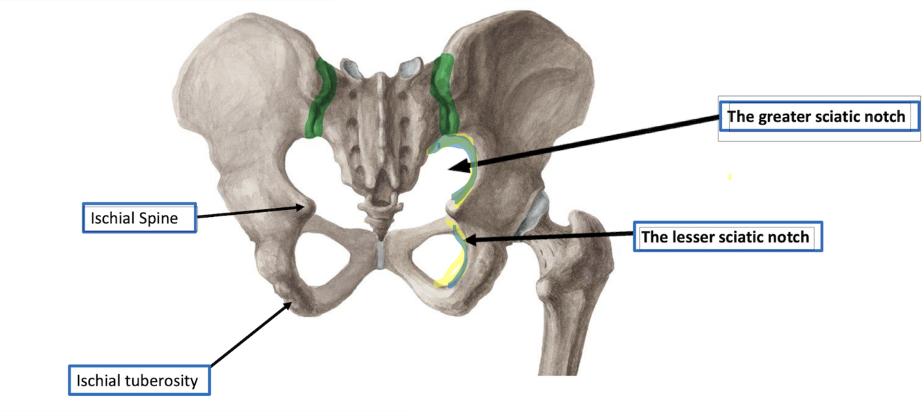 * greater sciatic notch is located on (…) surface of (… portion of hip bone …)