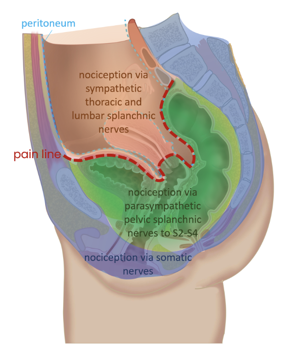 ⇒ referred pain to perineum and sacral dermatomes