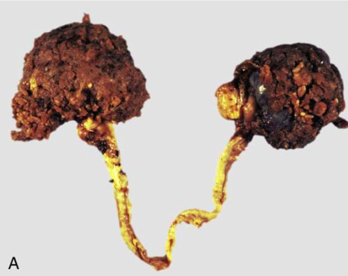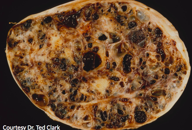 ovarian carcinoma is common in? what is the cause? how do they look?