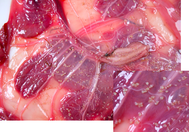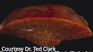 multifocal small white foci of necrosis commonly in the liver but can be found everywhere, intranuclear inclusion bodies on histo