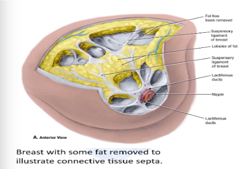 Adjacent to secretory lobules is dense fibrous tissue which is surrounded by adipose tissue