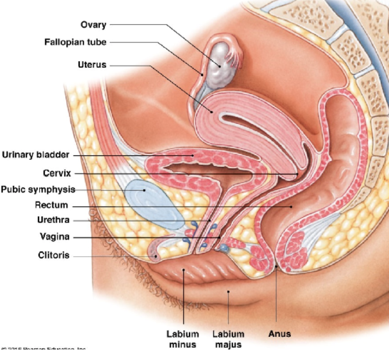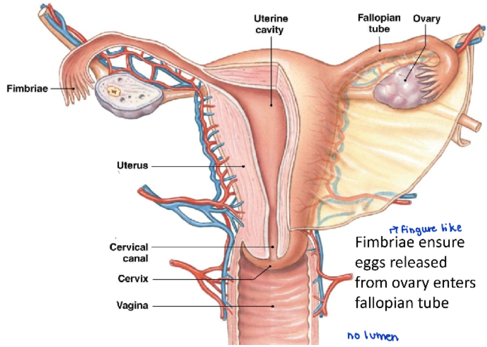 -contains 2 layers of smooth muscle similar to intestines and lined with cilia to move eggs to uterus