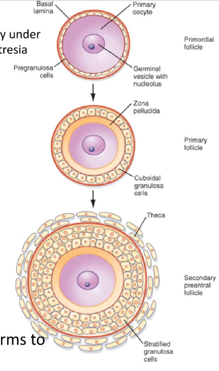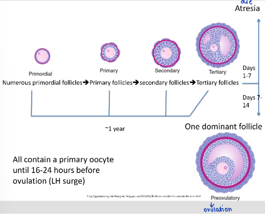 -primordial follicles are recruited each cycle (1 year complete maturation)