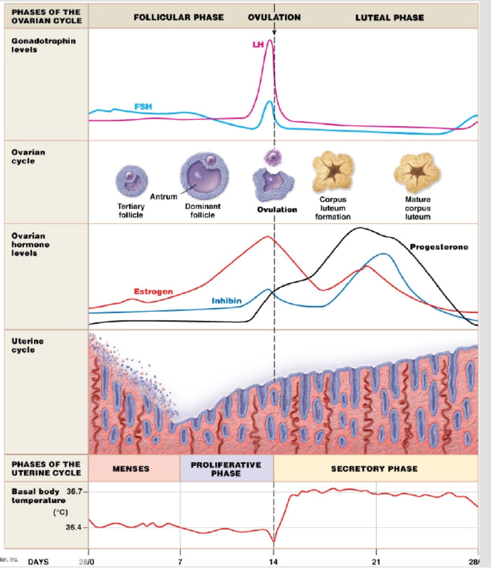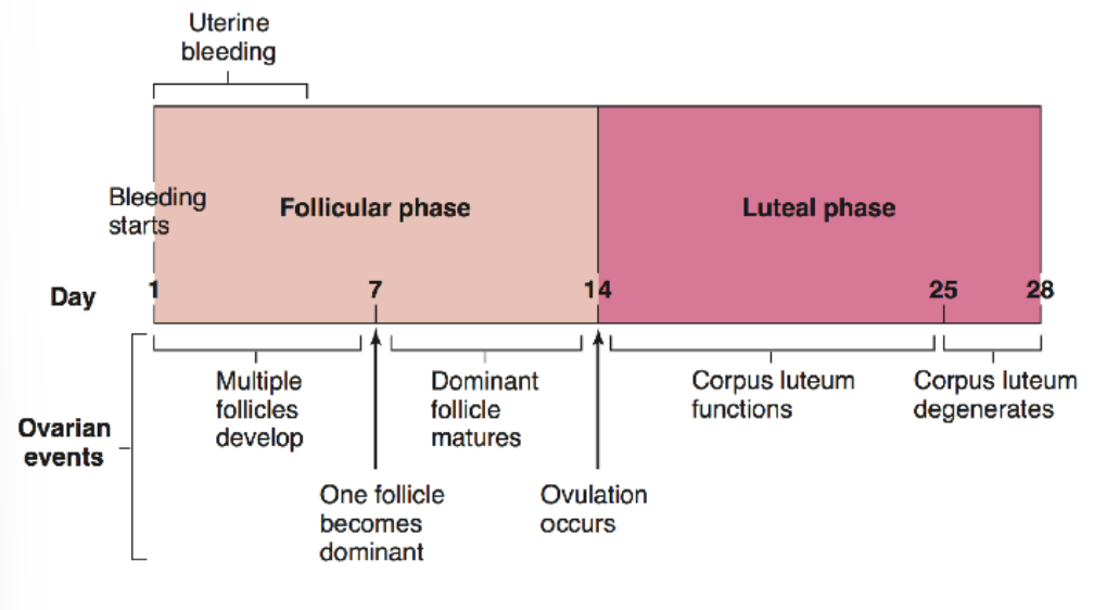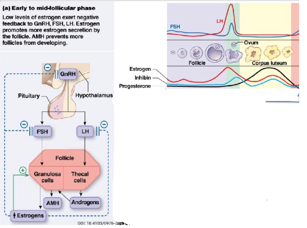-menses: the beginning of the follicular phase in ovary corresponds with menstrual bleeding from the uterus (endometrial layer)